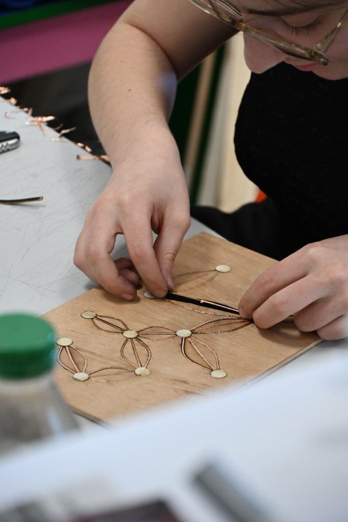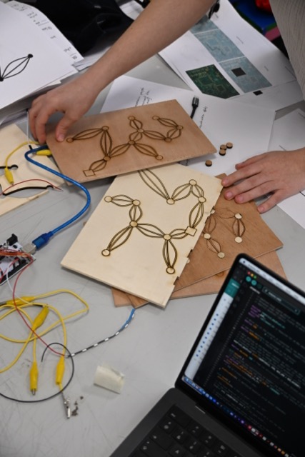 Le projet intègre également une dimension interactive, un système de lumières (LED) s’allume progressivement, point par point. L’allumage suit une logique de proximité entre les nœuds du circuit, simulant une circulation d’énergie. Chaque interaction (touche, activation) déclenche un changement de LED, créant une animation évolutive du motif.