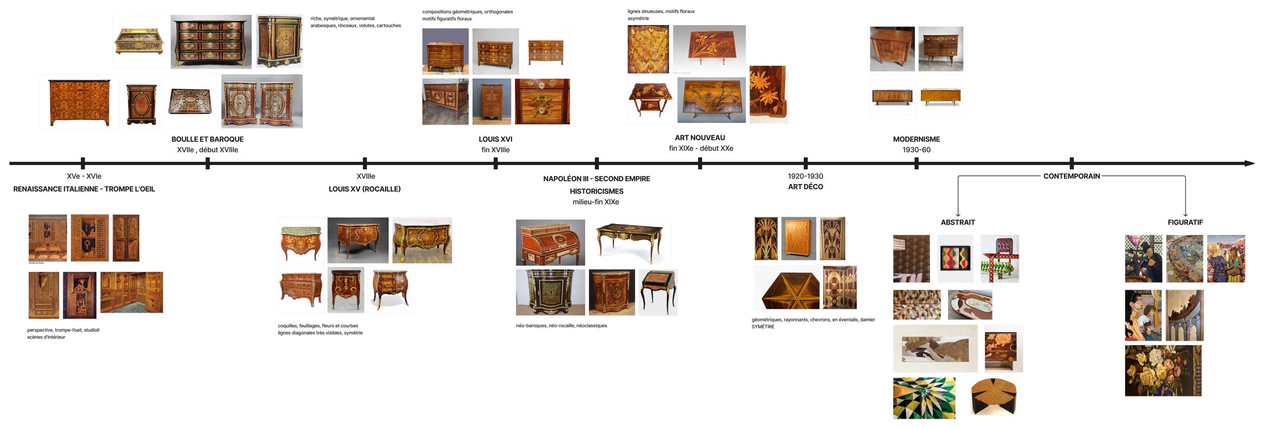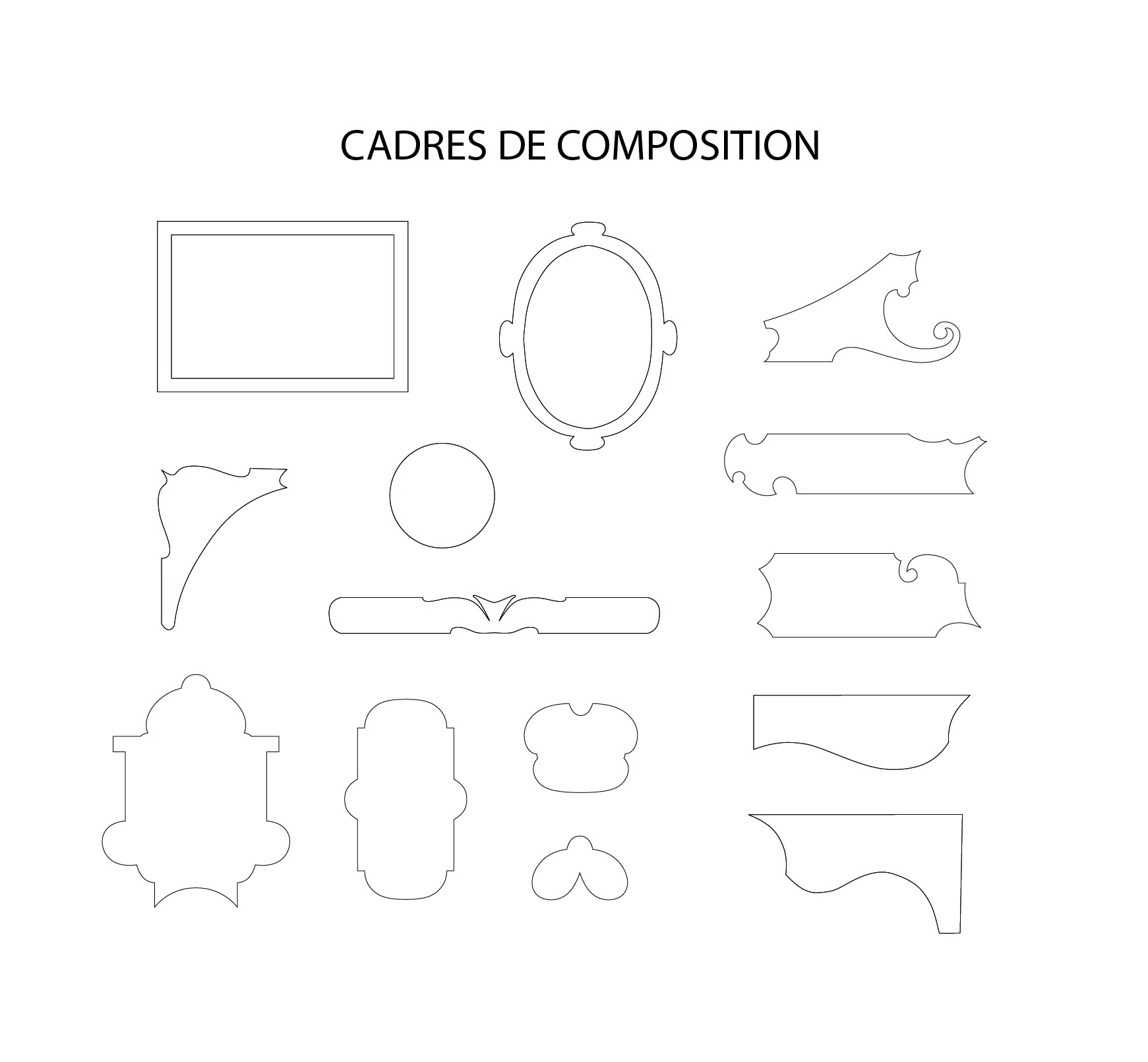 Nous avons également dessiné des cadres de composition, particulièrement présents dans la marqueterie classique.