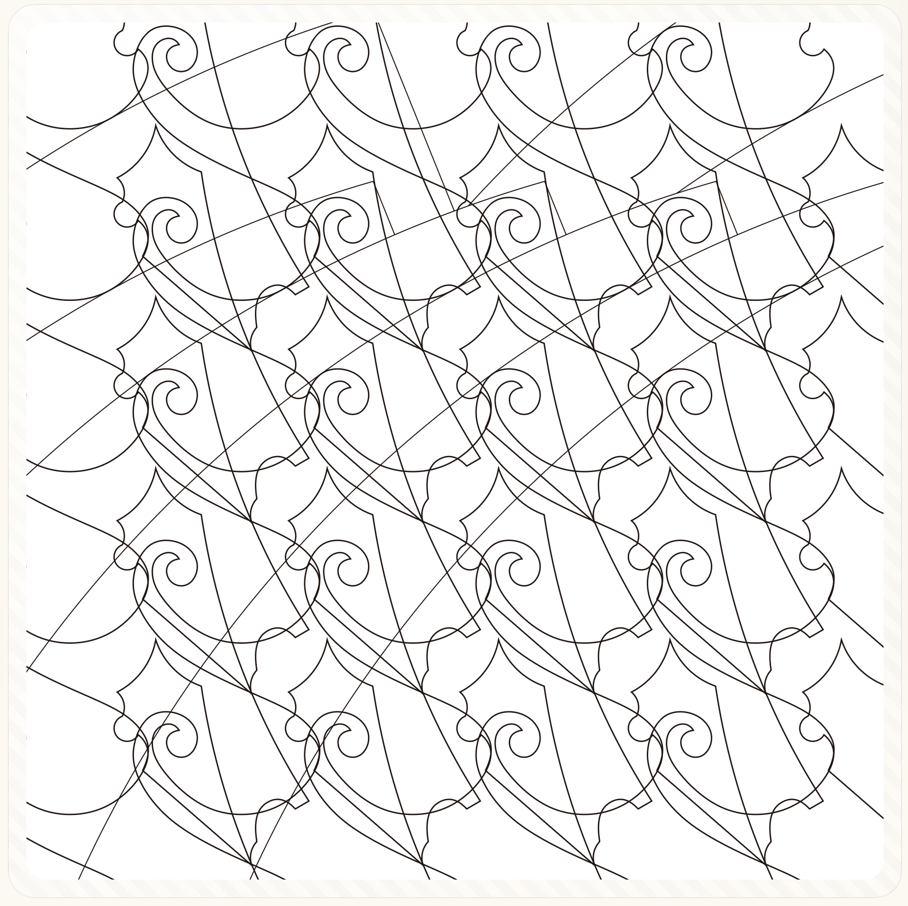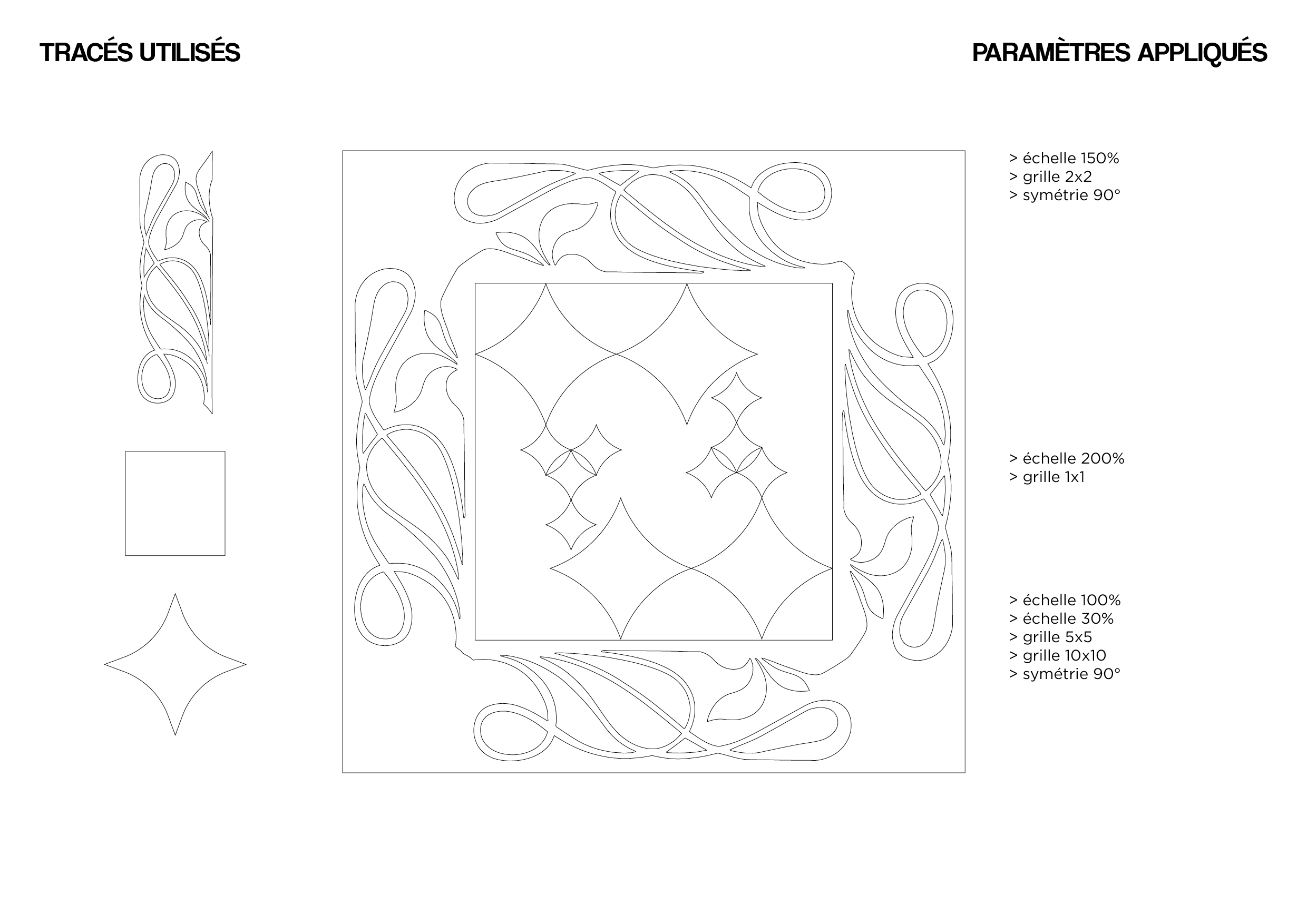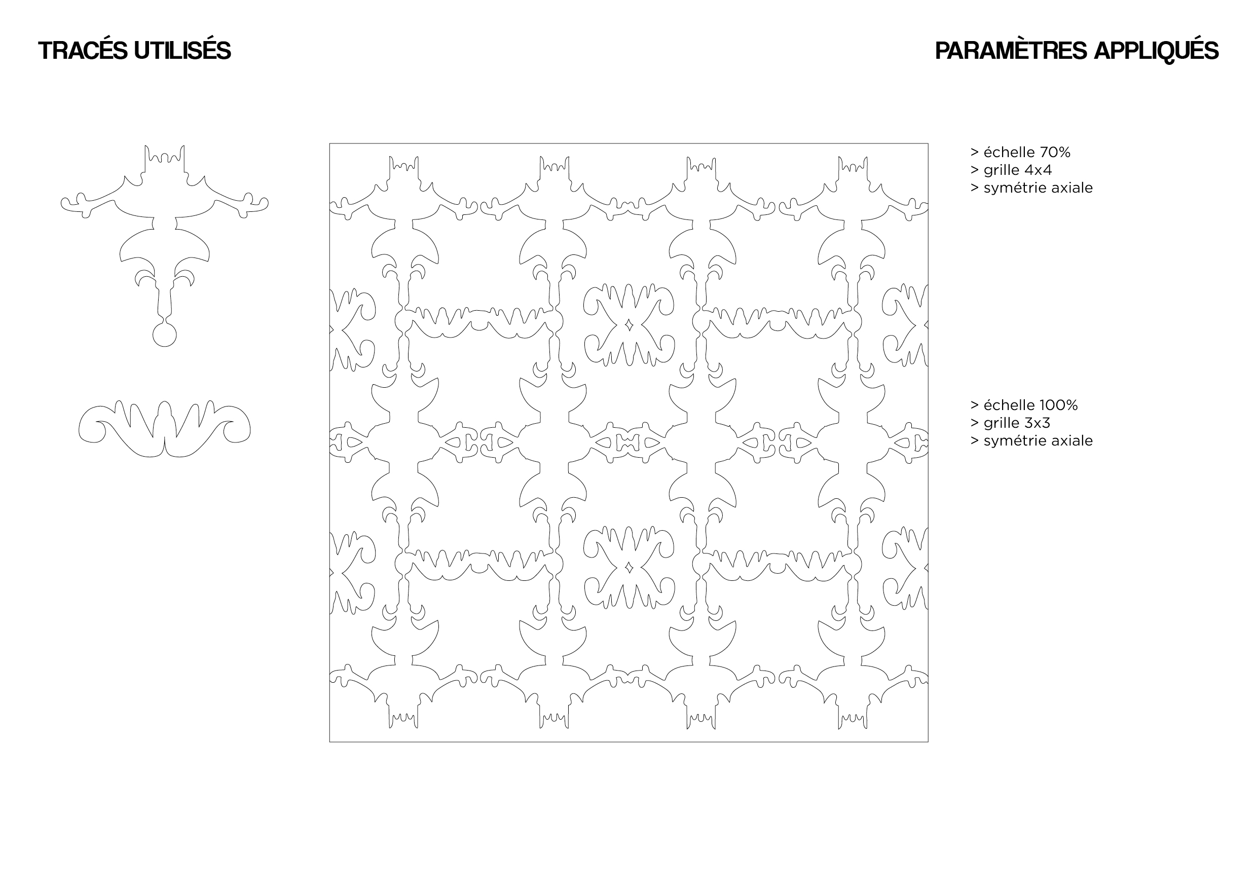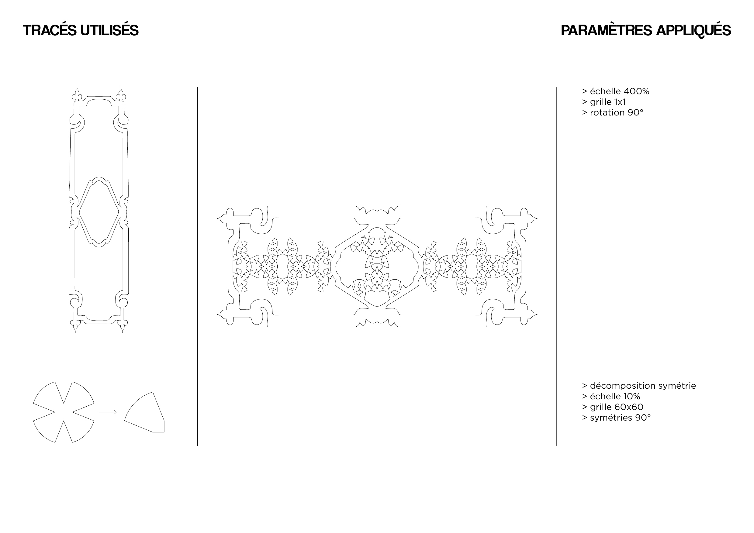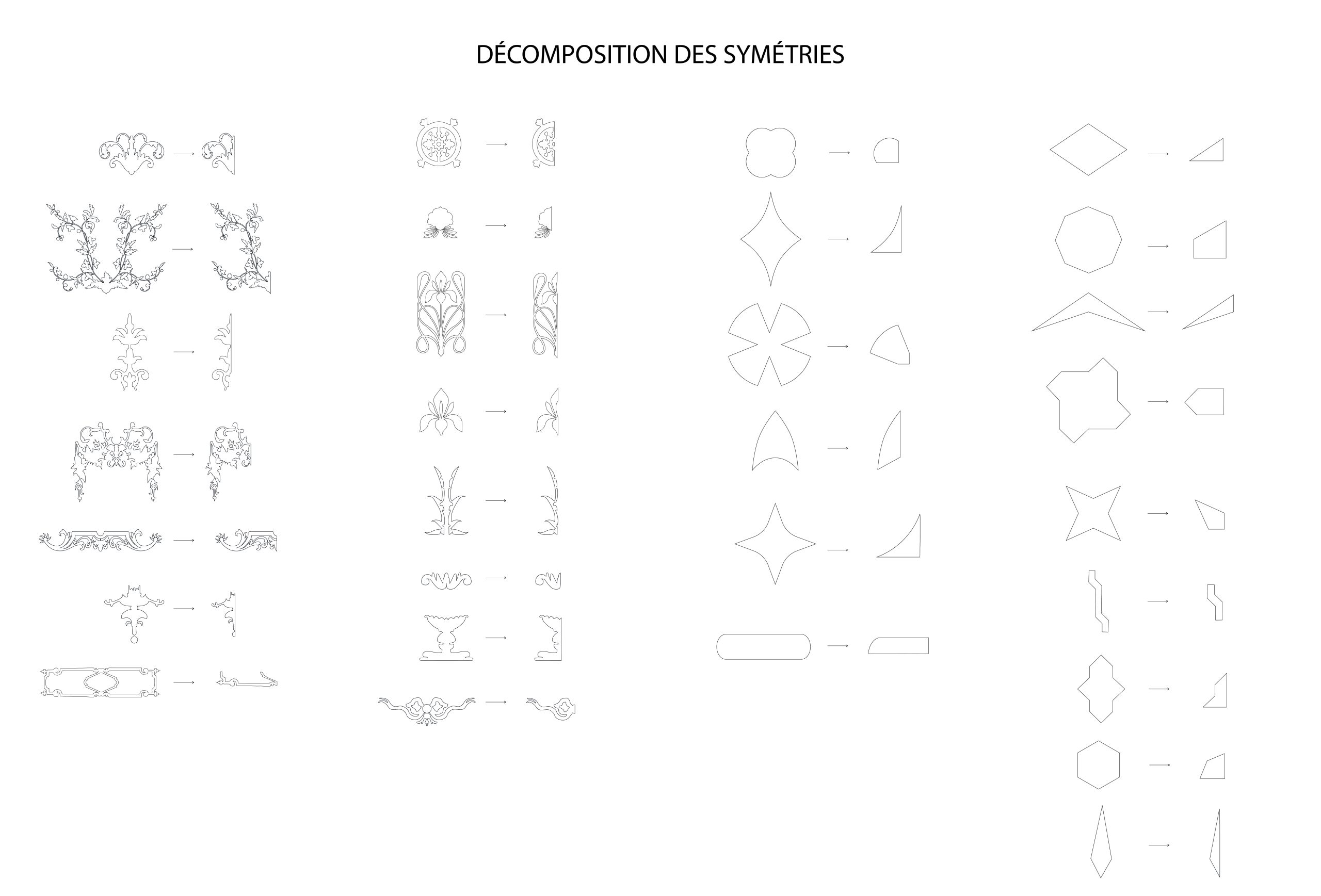 La plupart de ces tracés sont construits en suivant des symétries axiales. La décomposition de ces symétries nous a permis de décupler le nombre de tracés de notre base de données, multipliant ainsi les possibilités de les exploiter.