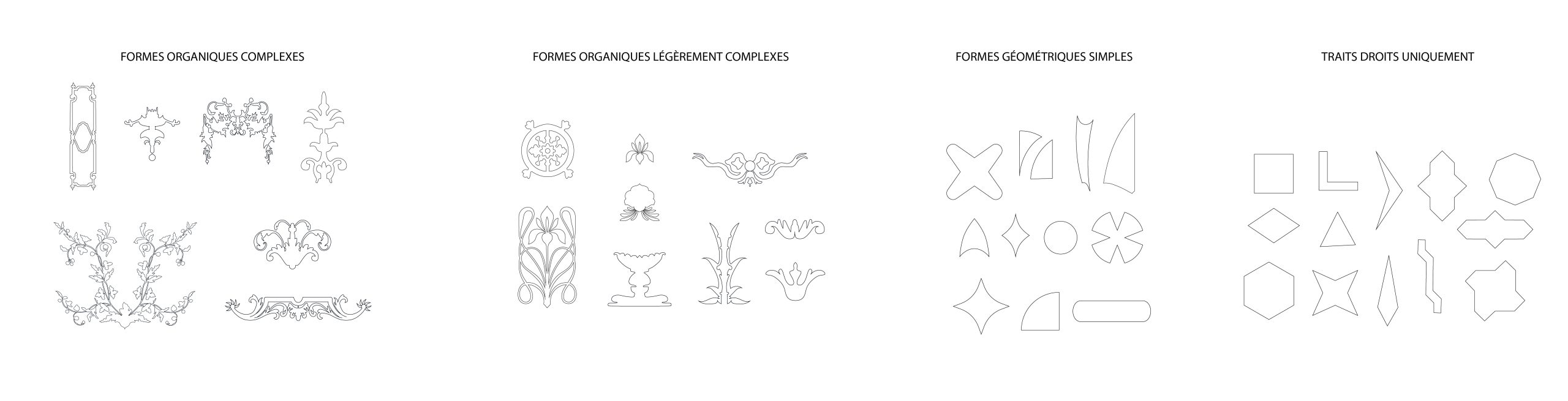 Nos observations nous ont permis de construire une base de données de tracés. Nous avons déterminé 4 quatre niveaux de formes, des plus organiques et complexes aux plus géométriques et orthogonales. Cette observation souligne le changement brutal qui s’est opéré dans l’évolution du décor, ainsi que le fossé immense qui sépare ces deux univers.