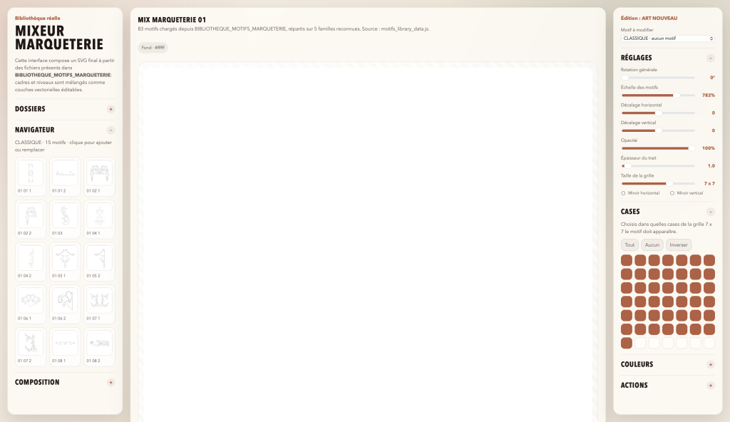 À partir de notre base de donnée et à travers différents réglages, cette interface permet de combiner les motifs et créer une infinité de possibilités. Le résultat est exportable en SVG et prêt à être marqueté.
